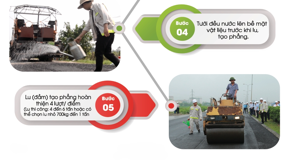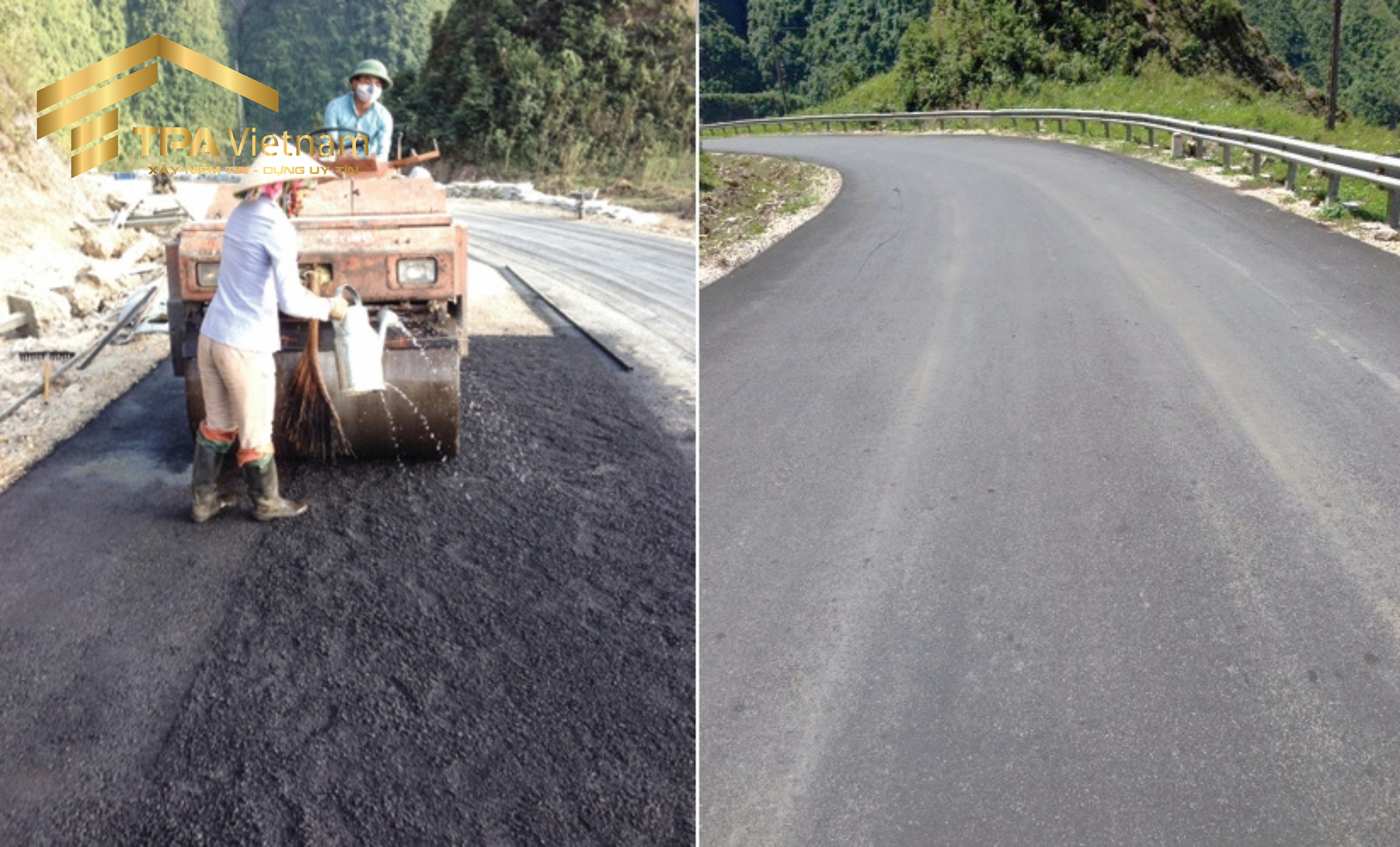 - Cơ chế đóng rắn: Nhờ lực đầm nén và sự tiếp xúc với không khí, các hạt nhựa sẽ “khóa” vào nhau. Càng có xe cộ di chuyển qua lại nhiều (tạo lực nén liên tục) thì mặt đường càng trở nên cứng cáp và mịn màng.